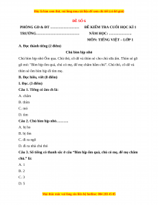 Đề thi Tiếng Việt lớp 1 Học kì 1 Cánh diều (Đề 6)
