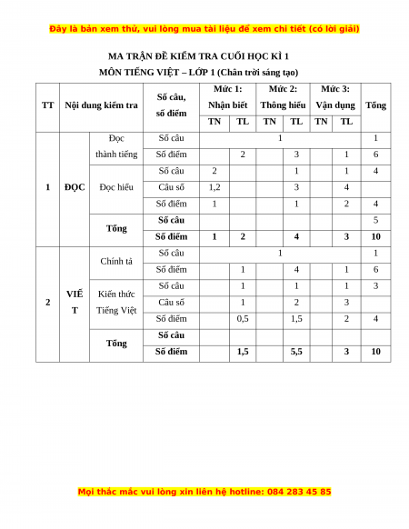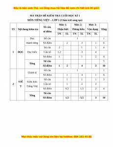 Thông hiểu Vận dụng Tổng số điểm TN TL TN TL TN TL Đọc Số câu 1 1 thành tiếng Số điểm 2 3 1 6 Số câu 2 1 1 4 1 ĐỌC Đọc hiểu Câu số 1,2 3 4 Số điểm 1 1 2 4 Số câu 5 Tổng Số điểm 1 2 4 3 10 Số câu 1 1 Chính tả Số điểm 1 4 1 6 Số câu 1 1 1 3 VIẾ Kiến thức 2 Câu số 1 2 3 T Tiếng Việt Số điểm 0,5 1,5 2 4 Số câu Tổng Số điểm 1,5 5,5 3 10