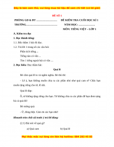 MÔN: TIẾNG VIỆT – LỚP 1 A. Kiểm tra đọc