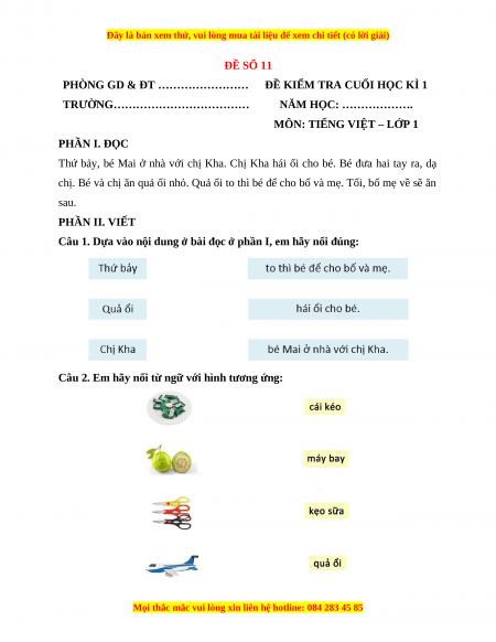 ĐÁP ÁN ĐỀ KIỂM TRA CUỐI HỌC KÌ 1 ĐỀ SỐ 11 PHẦN I. ĐỌC
