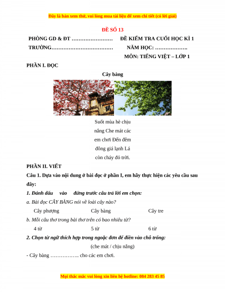 MÔN: TIẾNG VIỆT – LỚP 1 PHẦN I. ĐỌC Cây bàng Suốt mùa hè chịu nắng Che mát các em chơi Đến đêm đông giá lạnh Lá còn cháy đỏ trời. PHẦN II. VIẾT