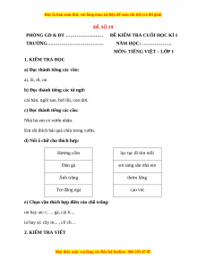 Đề thi Tiếng Việt lớp 1 Học kì 1 Chân trời sáng tạo (Đề 19)