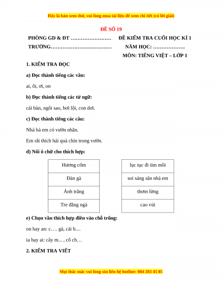 MÔN: TIẾNG VIỆT – LỚP 1 1. KIỂM TRA ĐỌC