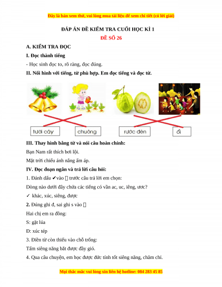 ĐÁP ÁN ĐỀ KIỂM TRA CUỐI HỌC KÌ 1 ĐỀ SỐ 26 A. KIỂM TRA ĐỌC