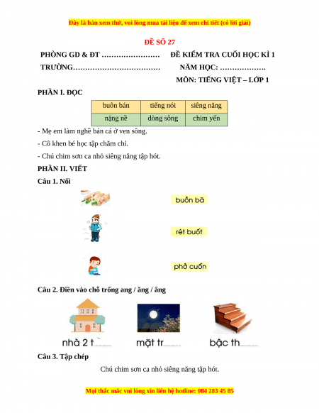 Đề thi Tiếng Việt lớp 1 Học kì 1 Chân trời sáng tạo (Đề 27)