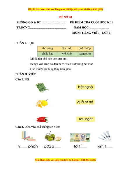 Đề thi Tiếng Việt lớp 1 Học kì 1 Chân trời sáng tạo (Đề 28)