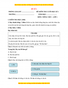 Đề thi Tiếng Việt lớp 1 Học kì 1 Kết nối tri thức (Đề 1)