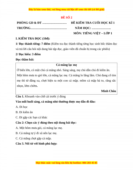 2/ Đọc hiểu: 3 điểm Đọc thầm bài: Cá măng lạc mẹ