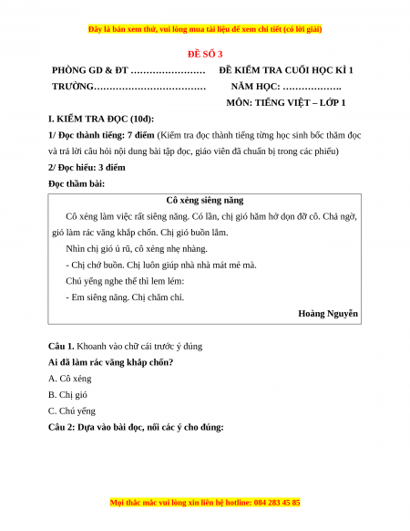 Đề thi Tiếng Việt lớp 1 Học kì 1 Kết nối tri thức (Đề 3)