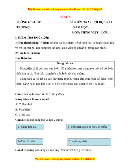 2/ Đọc hiểu: 3 điểm Đọc thầm bài: Nàng tiên cá