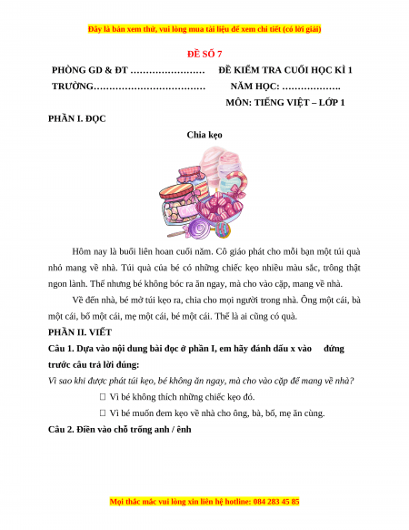 MÔN: TIẾNG VIỆT – LỚP 1 PHẦN I. ĐỌC Chia kẹo