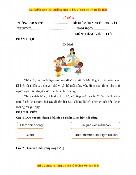 Đề thi Tiếng Việt lớp 1 Học kì 1 Kết nối tri thức (Đề 8)
