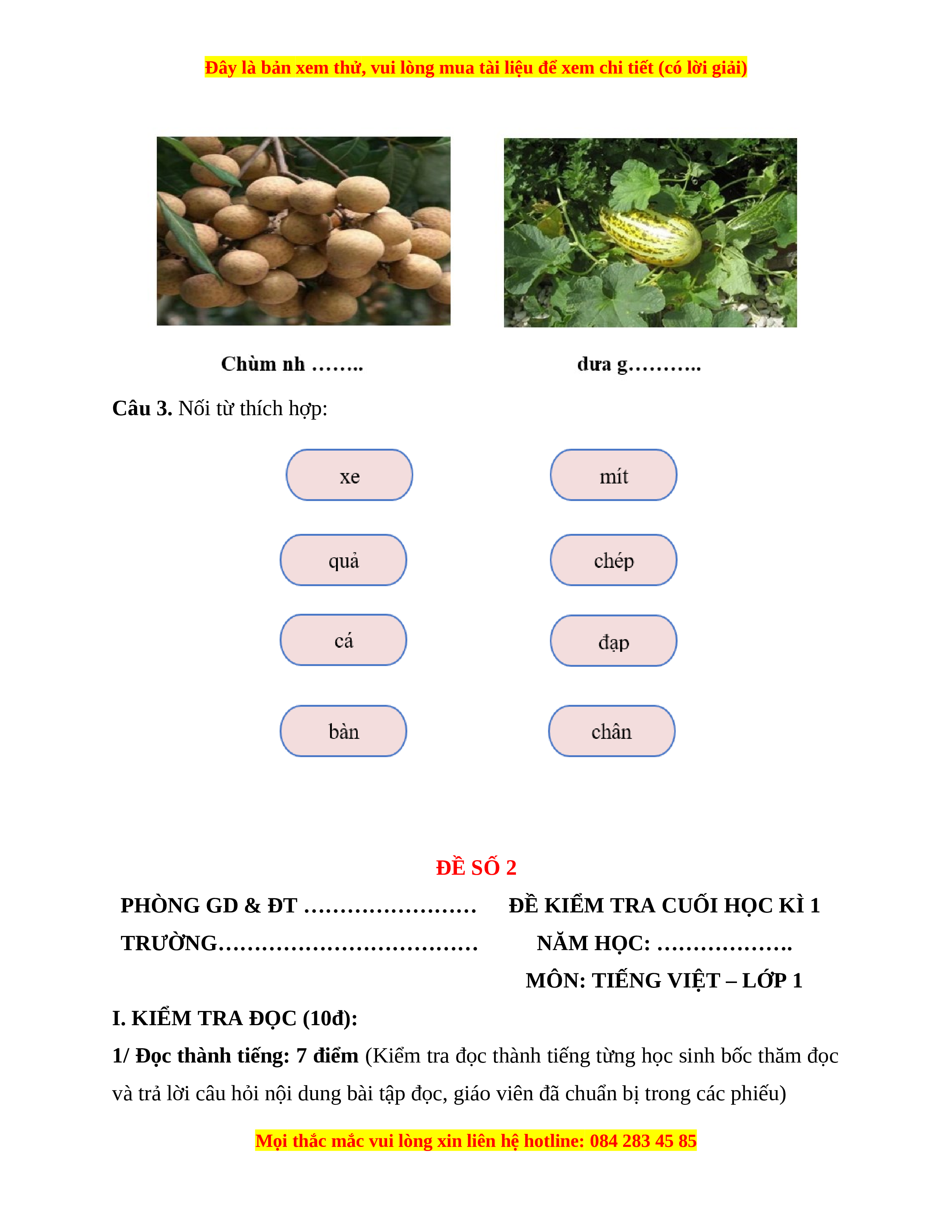 1/ Đọc thành tiếng: 7 điểm (Kiểm tra đọc thành tiếng từng học sinh bốc thăm đọc