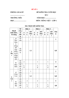 MA TRẬN ĐỀ KIỂM TRA Số Mức 1 Mức 2 Mức 3 Mạch câu, HT HT HT Tổn kiến thức, số T T T T T T khá khá khá g kĩ năng điể N L N L N L c c c m a) Số 1 1 Đọc câu thàn h tiếng kết Số hợp điể 6,0 6,0 1. kiểm m Đọ tra kĩ c năng nghe nói Số 2 1 1 4 b) câu Đọc Số 2, 1, 1, hiểu điể 4,0 0 0 0 m Số 1 1 a) câu Chín Số h tả điể 6,0 6,0 2. m Viế Số t 2 2 1 5 b) câu Bài Số 1, 1, 1, tập điể 4,0 5 5 0 m Số 2 2 2 3 2 11 câu Tổng Số 2, 1, 2, 2, điể 12,0 20,0 0 5 5 0 m ĐỀ KIỂM TRA