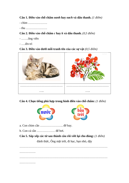 Câu 1. Điền vào chỗ chấm oanh hay oach và dấu thanh. (1 điểm) - chim ………………. - thu …………………