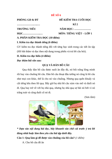 Câu 1: Quạ làm gì để được vào chuồng của bồ câu? (1 điểm) A. Cho bồ câu đồ ăn B. Bôi trắng lông mình C. Tự nhổ lông mình