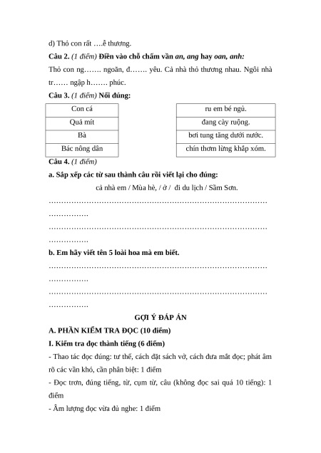 - Đọc trơn, đúng tiếng, từ, cụm từ, câu (không đọc sai quá 10 tiếng): 1 điểm
