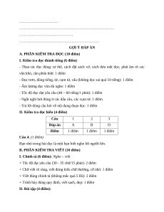 II. Kiểm tra đọc hiểu (4 điểm) Câu 1 2 3 Đáp án A B D Điểm 1 điểm 1 điểm 1 điểm