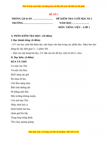 A. PHẦN KIỂM TRA ĐỌC: (10 điểm)