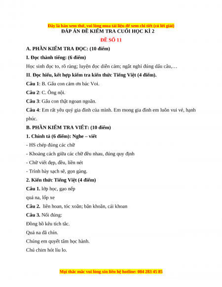 ĐÁP ÁN ĐỀ KIỂM TRA CUỐI HỌC KÌ 2 ĐỀ SỐ 11