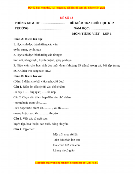 Đề thi Tiếng Việt lớp 1 Học kì 2 Chân trời sáng tạo (Đề 13)