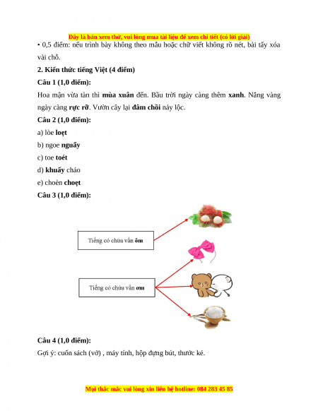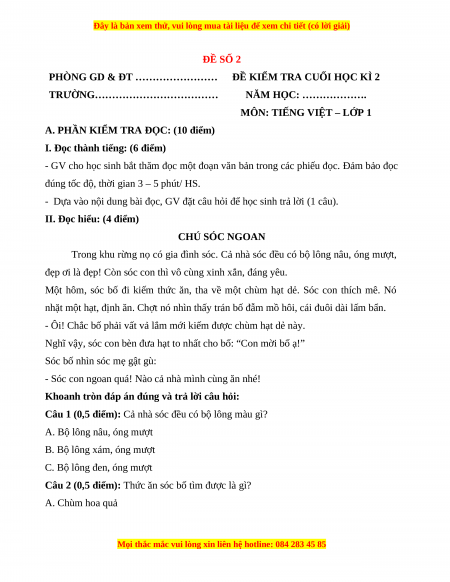 A. Bộ lông nâu, óng mượt Câu 2 (0,5 điểm): C. Chùm hạt dẻ Câu 3 (1,0 điểm):