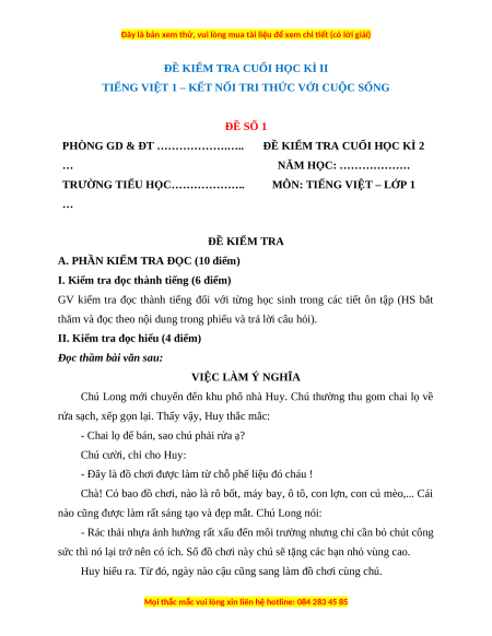 TIẾNG VIỆT 1 – KẾT NỐI TRI THỨC VỚI CUỘC SỐNG ĐỀ SỐ 1