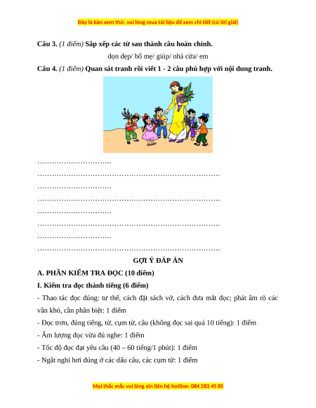 - Đọc trơn, đúng tiếng, từ, cụm từ, câu (không đọc sai quá 10 tiếng): 1 điểm