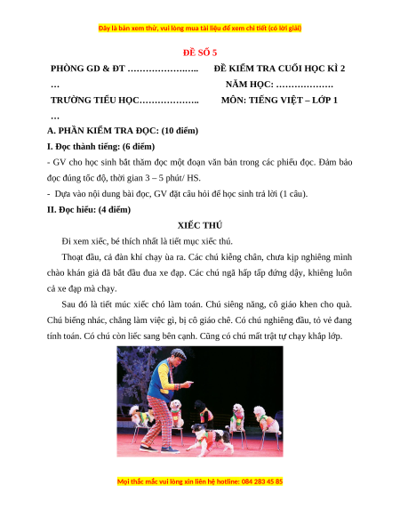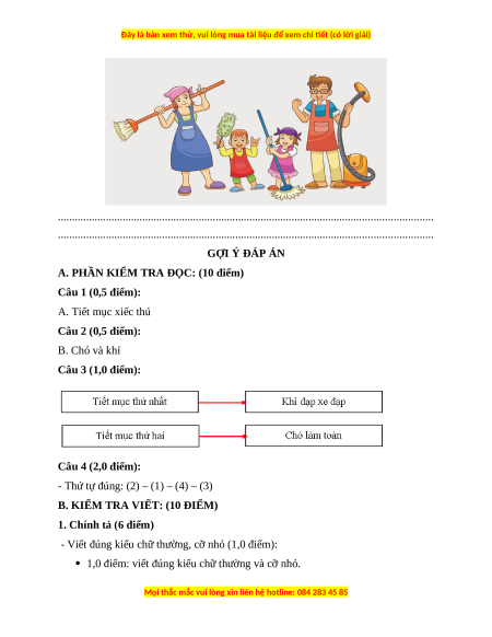 A. PHẦN KIỂM TRA ĐỌC: (10 điểm) Câu 1 (0,5 điểm): A. Tiết mục xiếc thú Câu 2 (0,5 điểm): B. Chó và khỉ Câu 3 (1,0 điểm): Câu 4 (2,0 điểm):