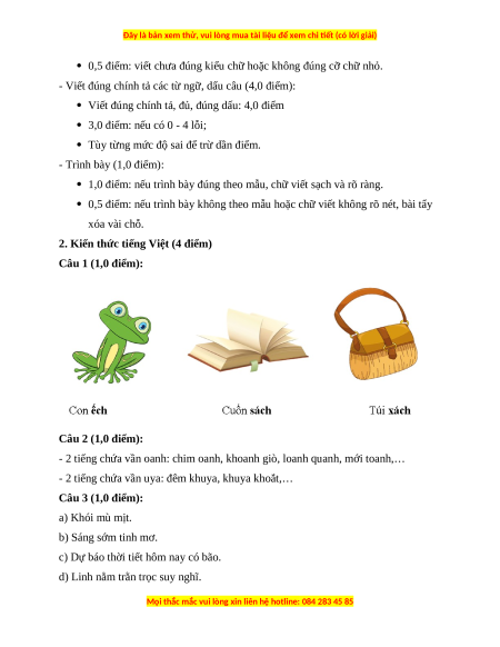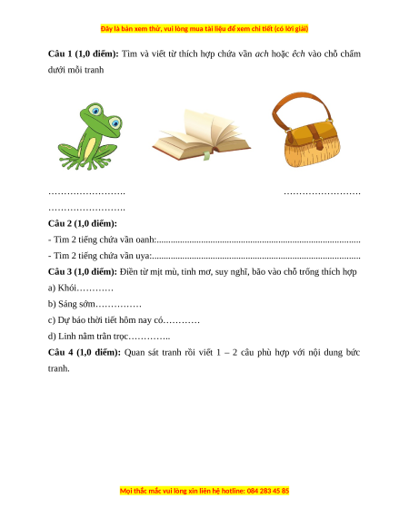 Câu 1 (1,0 điểm): Tìm và viết từ thích hợp chứa vần ach hoặc êch vào chỗ chấm dưới mỗi tranh