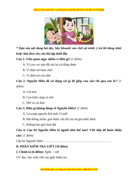 Câu 2: Nguyễn Hiền đã sử dụng cái gì để giúp vua xâu chỉ qua con ốc? (1 điểm) A. Cái kim B. Con kiến càng và mỡ C. Mỡ và cái kim