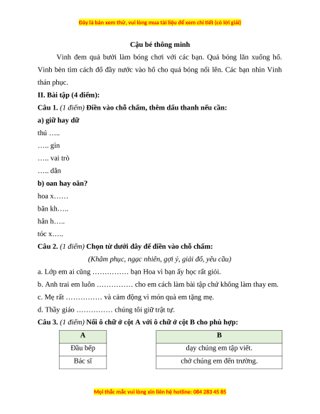 Câu 1. (1 điểm) Điền vào chỗ chấm, thêm dấu thanh nếu cần: a) giữ hay dữ thú ….. ….. gìn ….. vai trò ….. dằn b) oan hay oăn? hoa x…… băn kh….. hân h….. tóc x…..