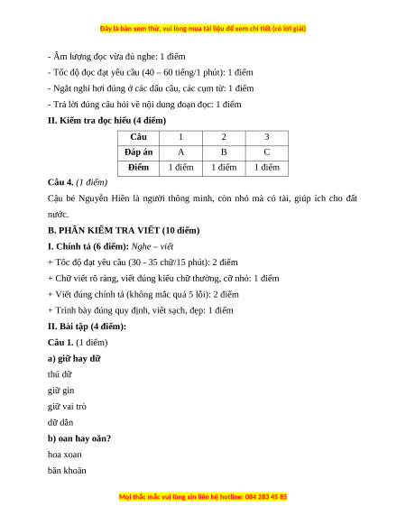 - Đọc trơn, đúng tiếng, từ, cụm từ, câu (không đọc sai quá 10 tiếng): 1 điểm