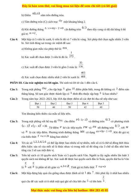PHẦN III. Câu trắc nghiệm trả lời ngắn. Thí sinh trả lời từ câu 1 đến câu 6. Câu 1: Trong mặt phẳng , cho tập hợp gồm