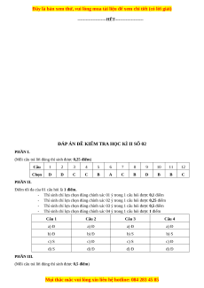 Thí sinh chỉ lựa chọn đúng chính xác 04 ý trong 1 câu hỏi được 1 điểm Câu 1 Câu 2 Câu 3 Câu 4 a) Đ a) Đ a) Đ a) Đ b) Đ b) Đ b) S b) S c) S c) Đ c) S c) Đ d) S d) Đ d) Đ d) Đ PHẦN III.