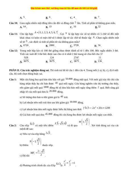 đồng thì cửa hàng thu được lợi nhuận mỗi ngày cao nhất. Câu 2: Cho elip có một tiêu điểm và đi qua
