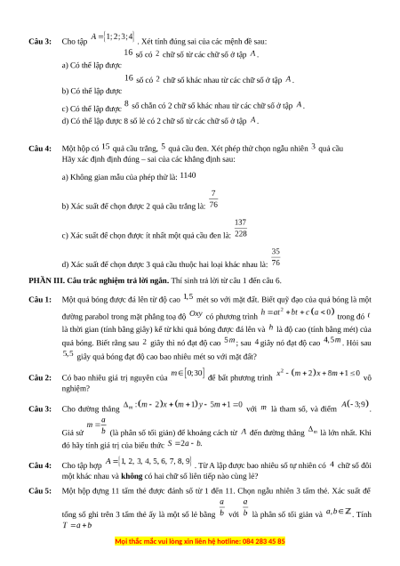 đó hãy tính giá trị của biểu thức Câu 4: Cho tập hợp