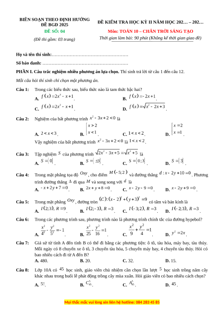 ĐỀ KIỂM TRA HỌC KỲ II NĂM HỌC 202… – 202… ĐỀ BGD 2025 ĐỀ SỐ: 04