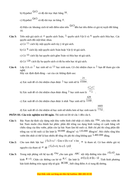d) Bất phương trình có tập nghiệm . Câu 2: Trong mặt phẳng , cho hypebol