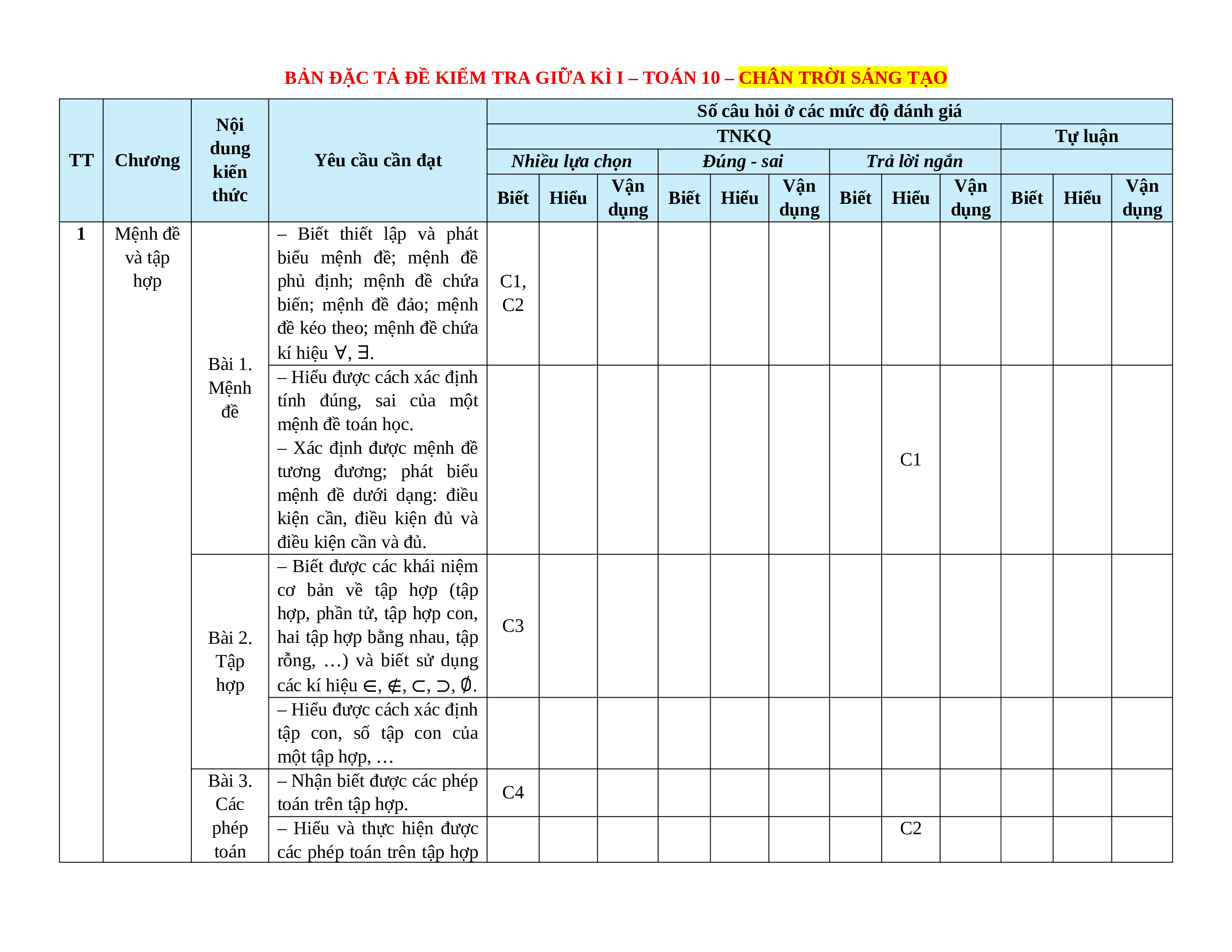 MA TRẬN ĐỀ KIỂM TRA GIỮA KÌ I – TOÁN 10 – CHÂN TRỜI SÁNG TẠO