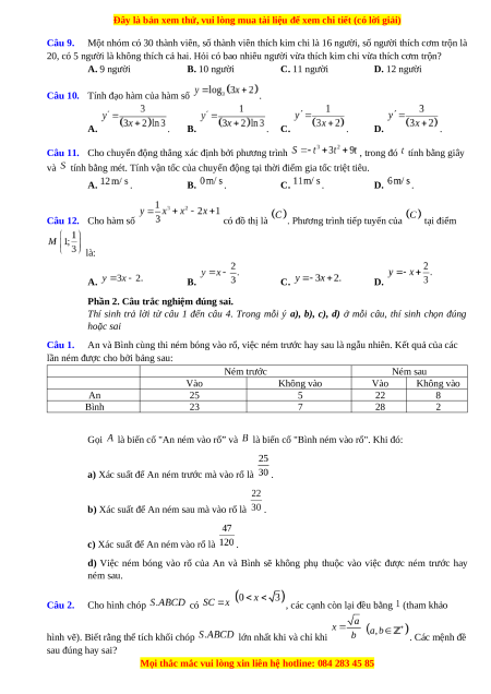 Gọi là biến cố "An ném vào rổ” và là biến cố "Bình ném vào rổ". Khi đó: