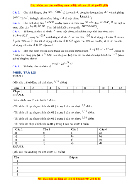 Tính đạo hàm của hàm số PHIẾU TRẢ LỜI PHẦN 1.