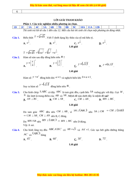 Thí sinh trả lời đáp án từ câu 1 đến câu 6. Câu 1.