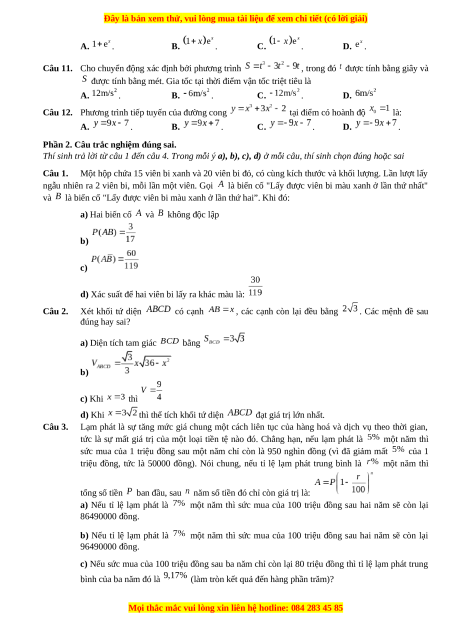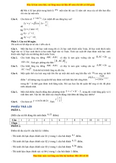 tính theo mét. Vận tốc lớn nhất của chuyển động chất điểm đó bằng bao nhiêu? Câu 6. Cho hàm số . Tính . PHIẾU TRẢ LỜI PHẦN 1.