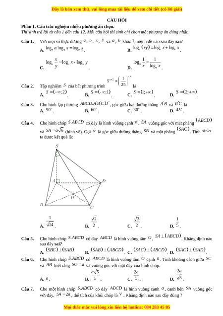 Thí sinh trả lời từ câu 1 đến câu 12. Mỗi câu hỏi thí sinh chỉ chọn một phương án đúng nhất. Câu 1.