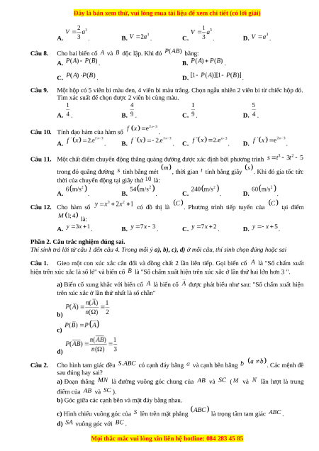 Cho hai biến cố và độc lập. Khi đó bằng: A. . B. . C. . D. . Câu 9.