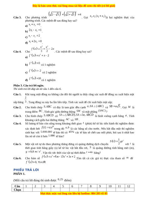 phương trình. Các mệnh đề sau đúng hay sai? a) . b) . c) . d) . Câu 4. Cho