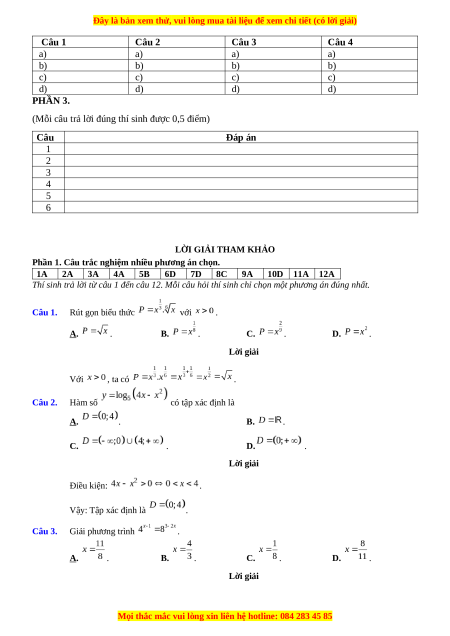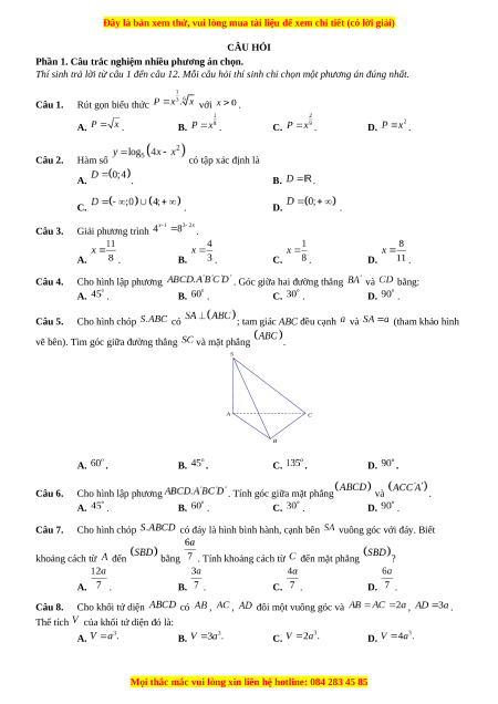 Thí sinh trả lời từ câu 1 đến câu 12. Mỗi câu hỏi thí sinh chỉ chọn một phương án đúng nhất. Câu 1. Rút gọn biểu thức với . A. . B. . C. . D. . Câu 2. Hàm số có tập xác định là A. . B. . C. . D. . Câu 3. Giải phương trình . A. . B. . C. . D. . Câu 4. Cho hình lập phương