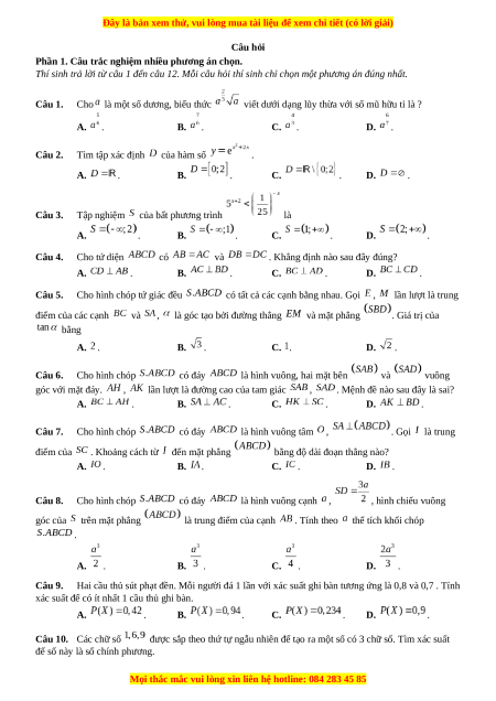 viết dưới dạng lũy thừa với số mũ hữu tỉ là ? A. . B. . C. . D. . Câu 2. Tìm tập xác định của hàm số . A. . B. . C. . D. . Câu 3.