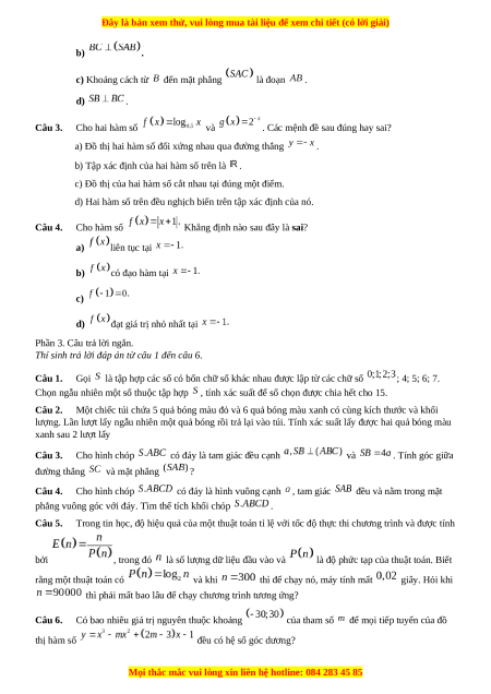 c) Khoảng cách từ đến mặt phẳng là đoạn . d) . Câu 3. Cho hai hàm số và